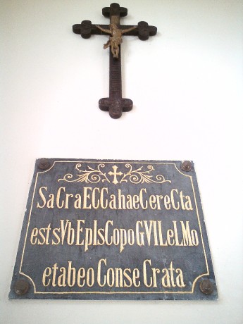 Zakladacia tabuľa s krížom, umiestnenie - hlavný vchod, predsieň, západná strana. Píše sa v nej doslova toto: Tento svätý chrám bol postavený za biskupa Viliama, a skrze neho aj posvätený. Chronostikon poukazuje na rok 1912